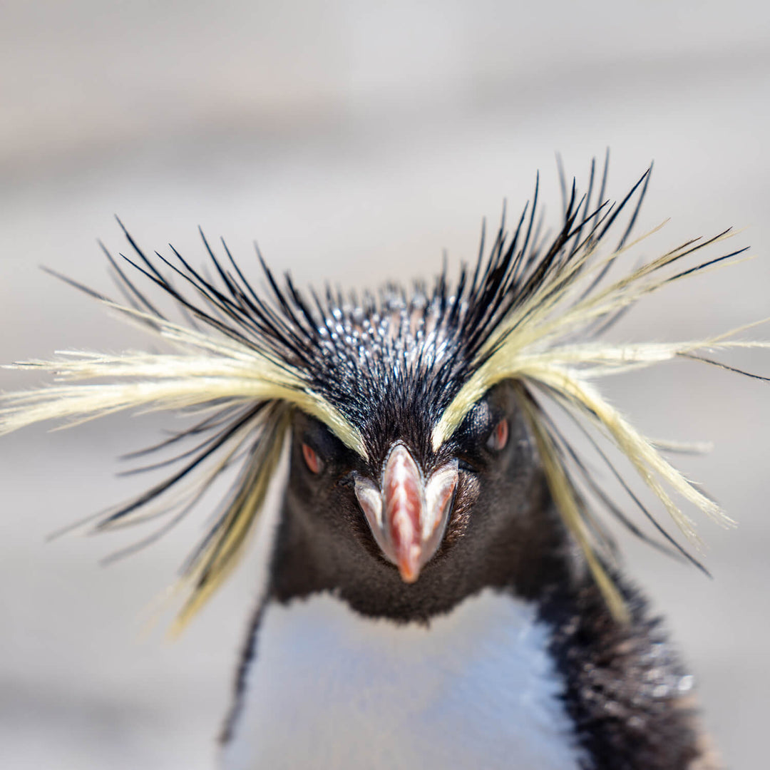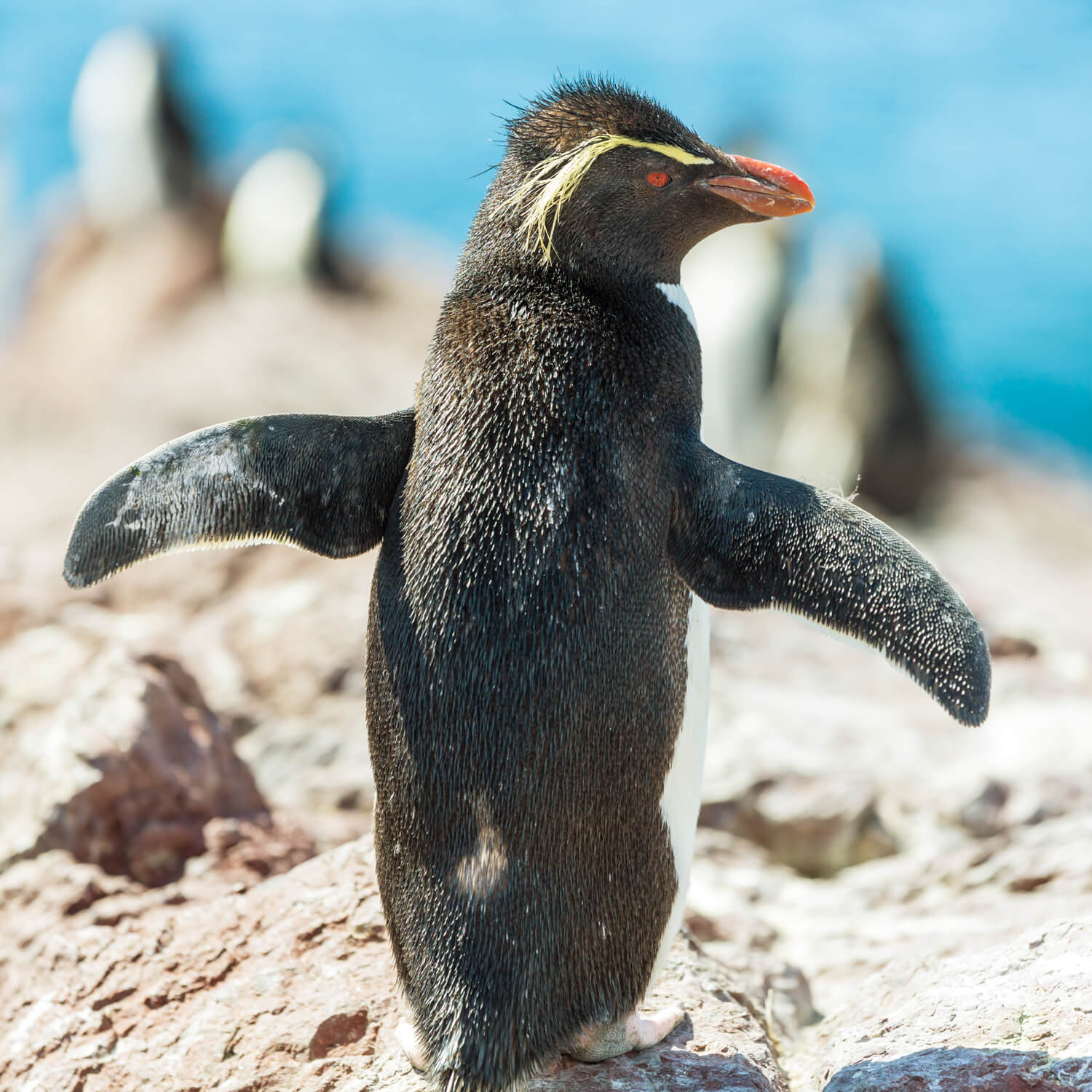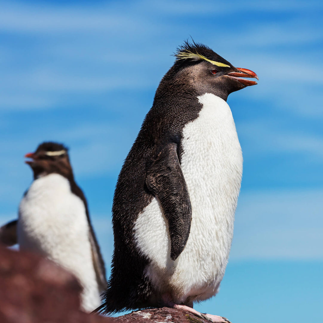 The rock stars of the penguin world, rockhopper penguins are easy to identify with their cool yellow spiky hairdos and deep-red eyes.