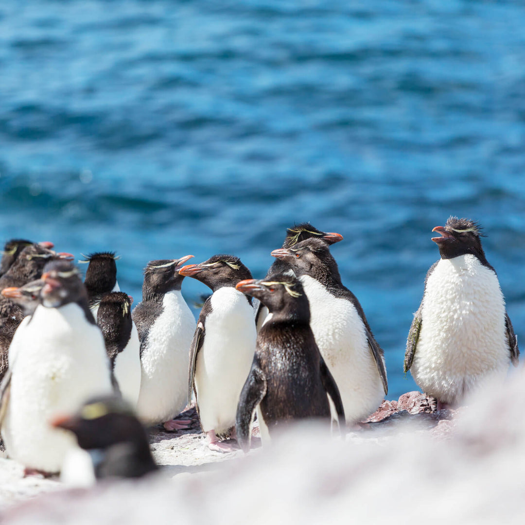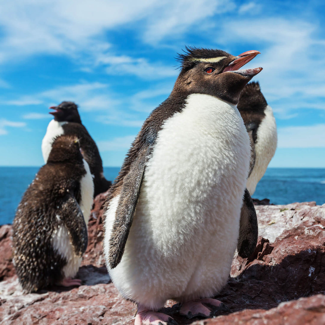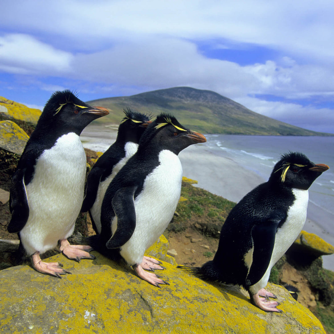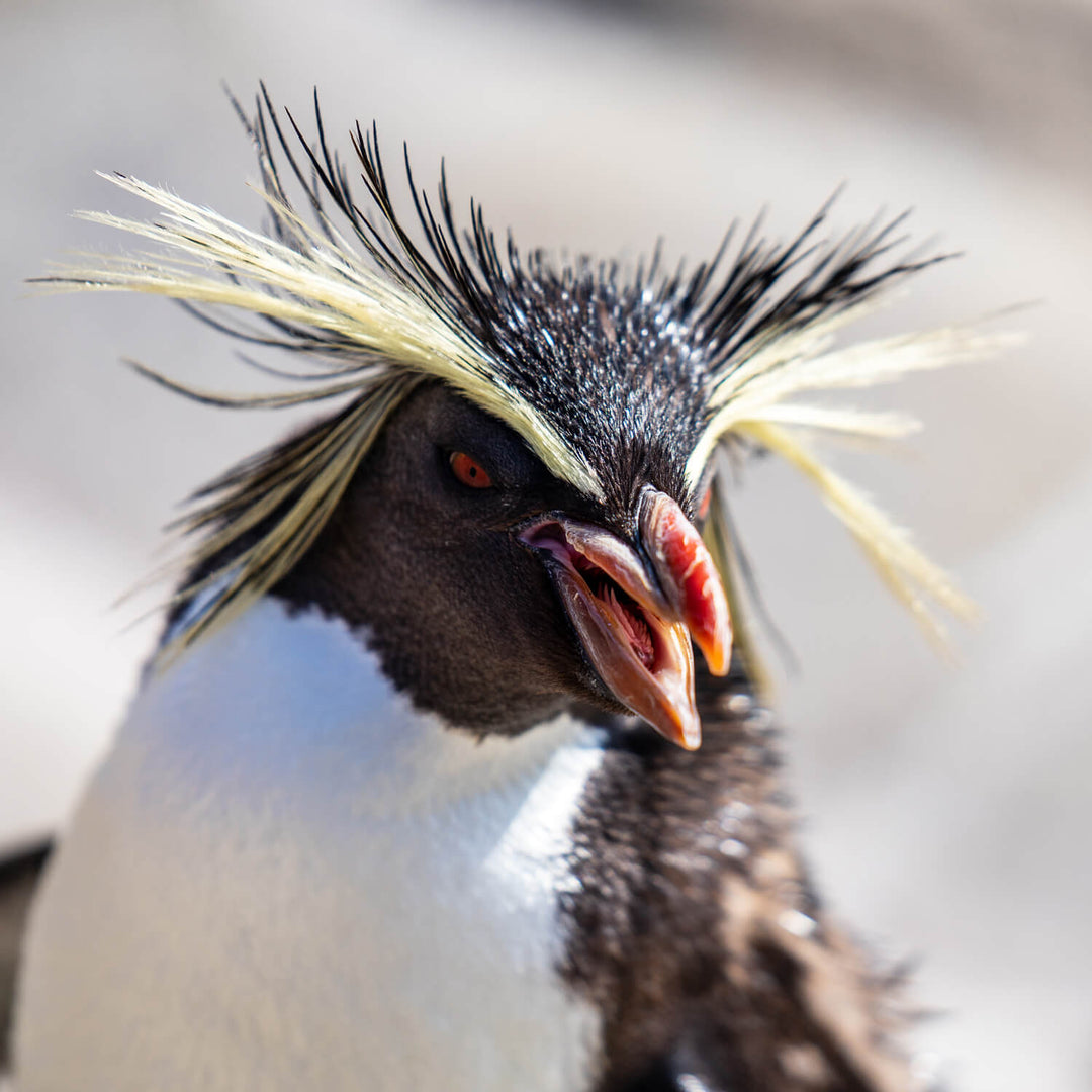 The rock stars of the penguin world, rockhopper penguins are easy to identify with their cool yellow spiky hairdos and deep-red eyes.